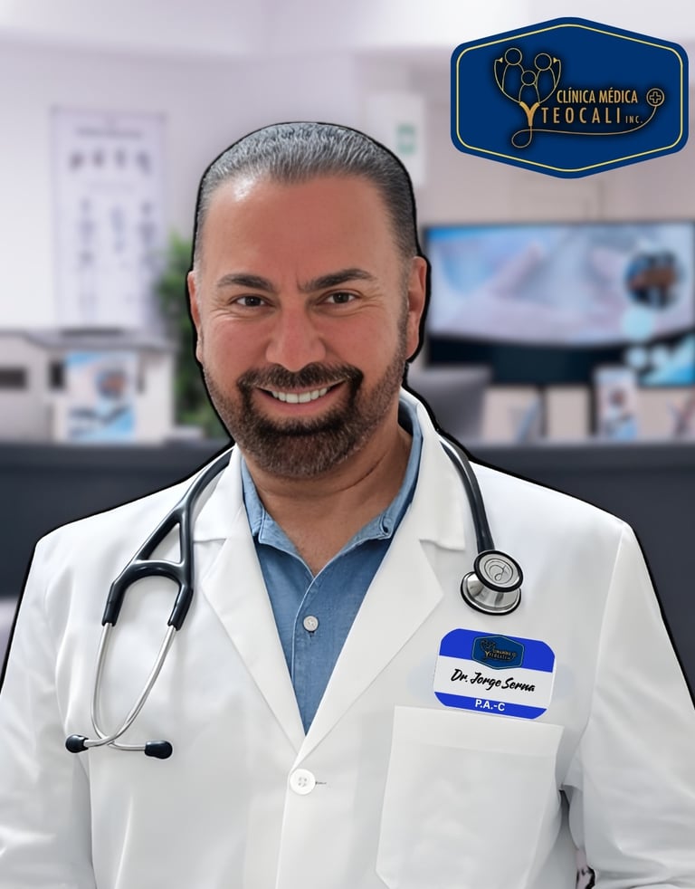 Con un compromiso inquebrantable con la ética y la calidez humana, el Dr. Jorge A. Serna se asegura de que en Clínica Médica Teocali, Inc., cada persona que cruza la puerta se sienta bienvenida, escuchada y cuidada con los más altos estándares médicos.